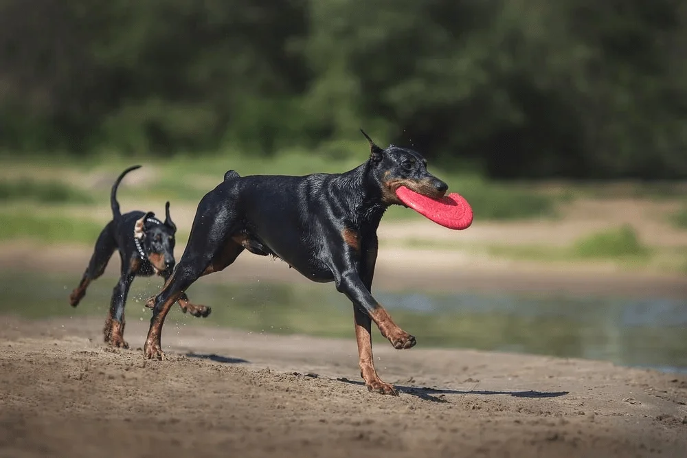 The Doberman pinscher is an intelligent, easy-to-train breed. They easily become bored and require mental and physical challenges throughout the day to prevent behavioral problems.