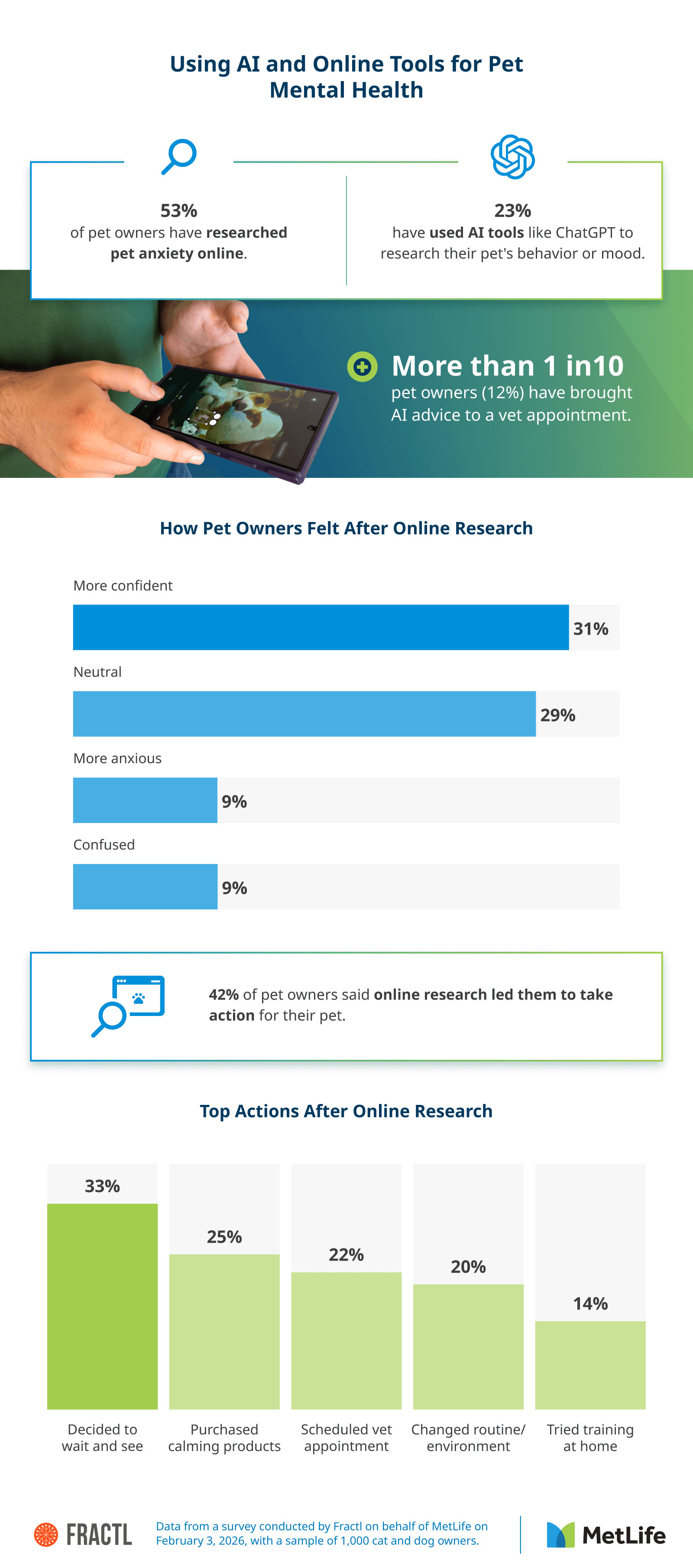 Among owners who used AI tools, the top reasons were understanding a specific behavior (26%), deciding if they should see a vet (17%), and researching treatments (16%). After using online or AI research, 42% said it led them to take action for their pet.