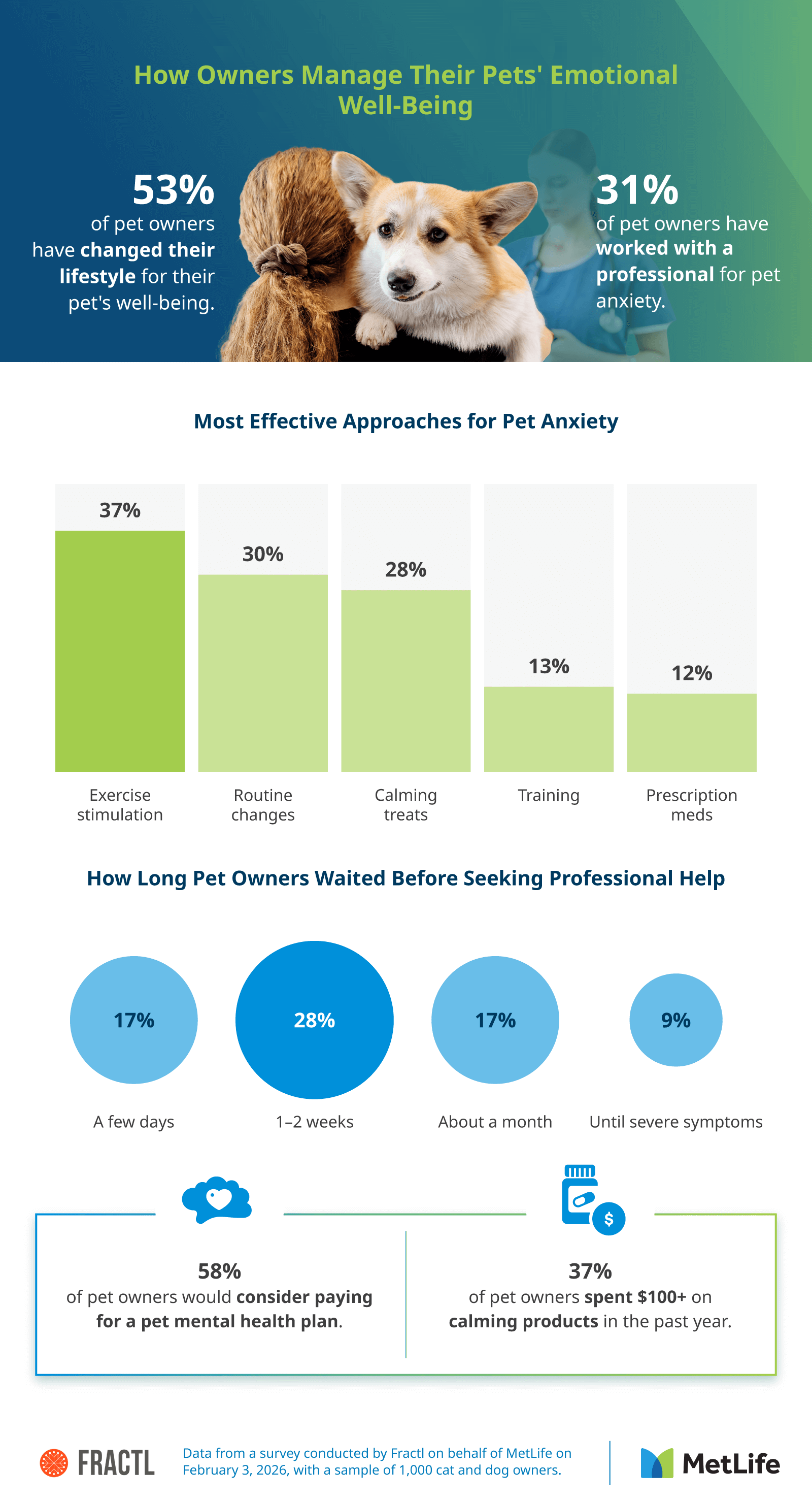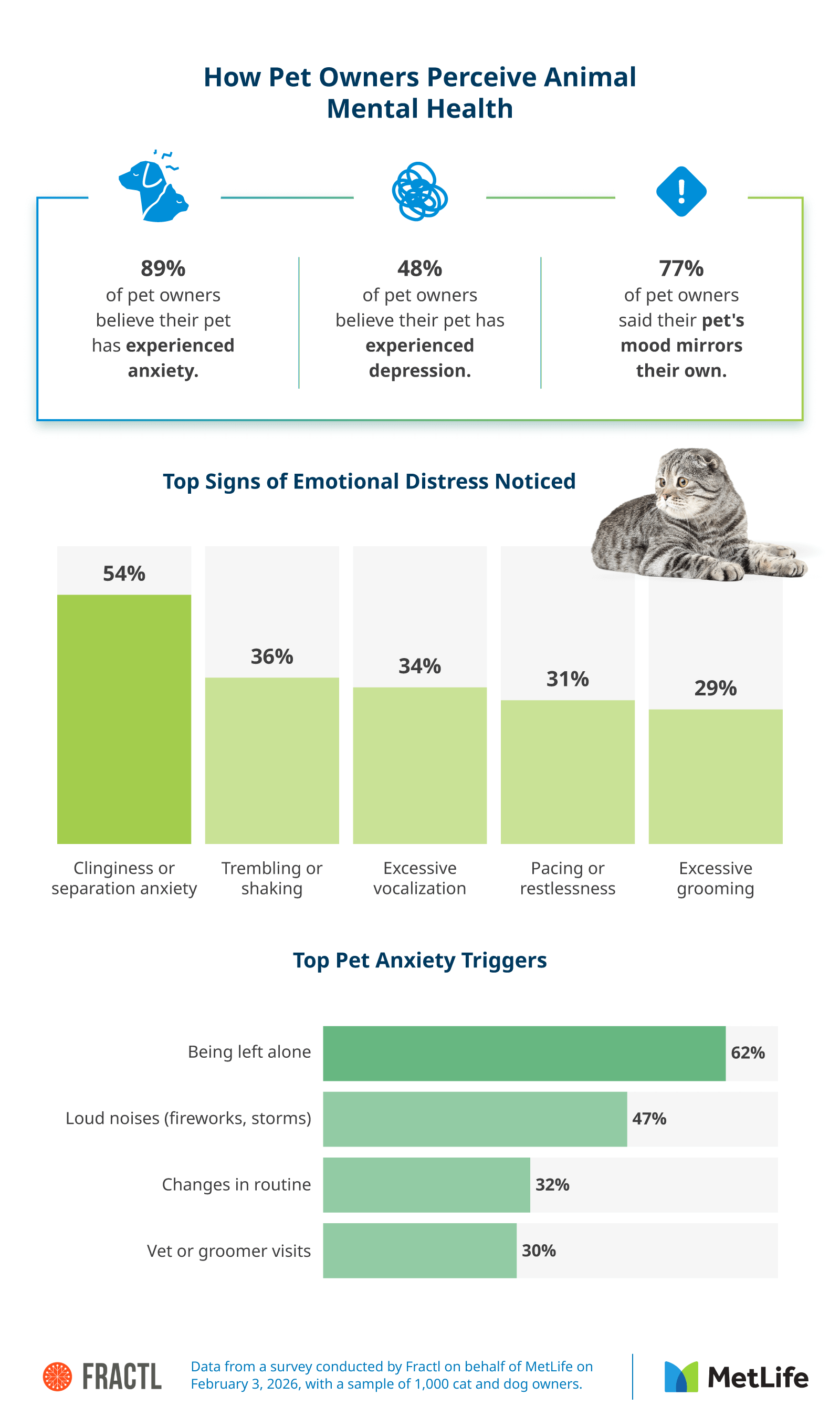 When your pet starts acting differently, it can be hard to know what's going on. Is it stress, a health issue, or just a temporary change? Fractl surveyed 1,000 U.S. cat and dog owners on behalf of MetLife to learn how pet parents interpret signs of emotional distress and what they do next. Their responses show how common these concerns are and how online searches and AI tools are affecting the steps owners take to support their pets.